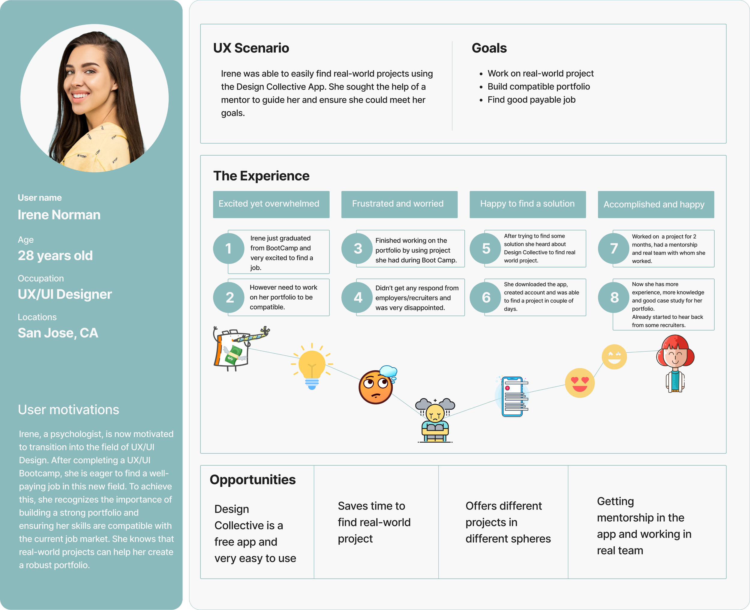 We found it helpful to build a persona because it gave us a clearer visualization of who we were designing for. In order to see how we could help Irene, we charted out all of her actions to identify opportunities for help.