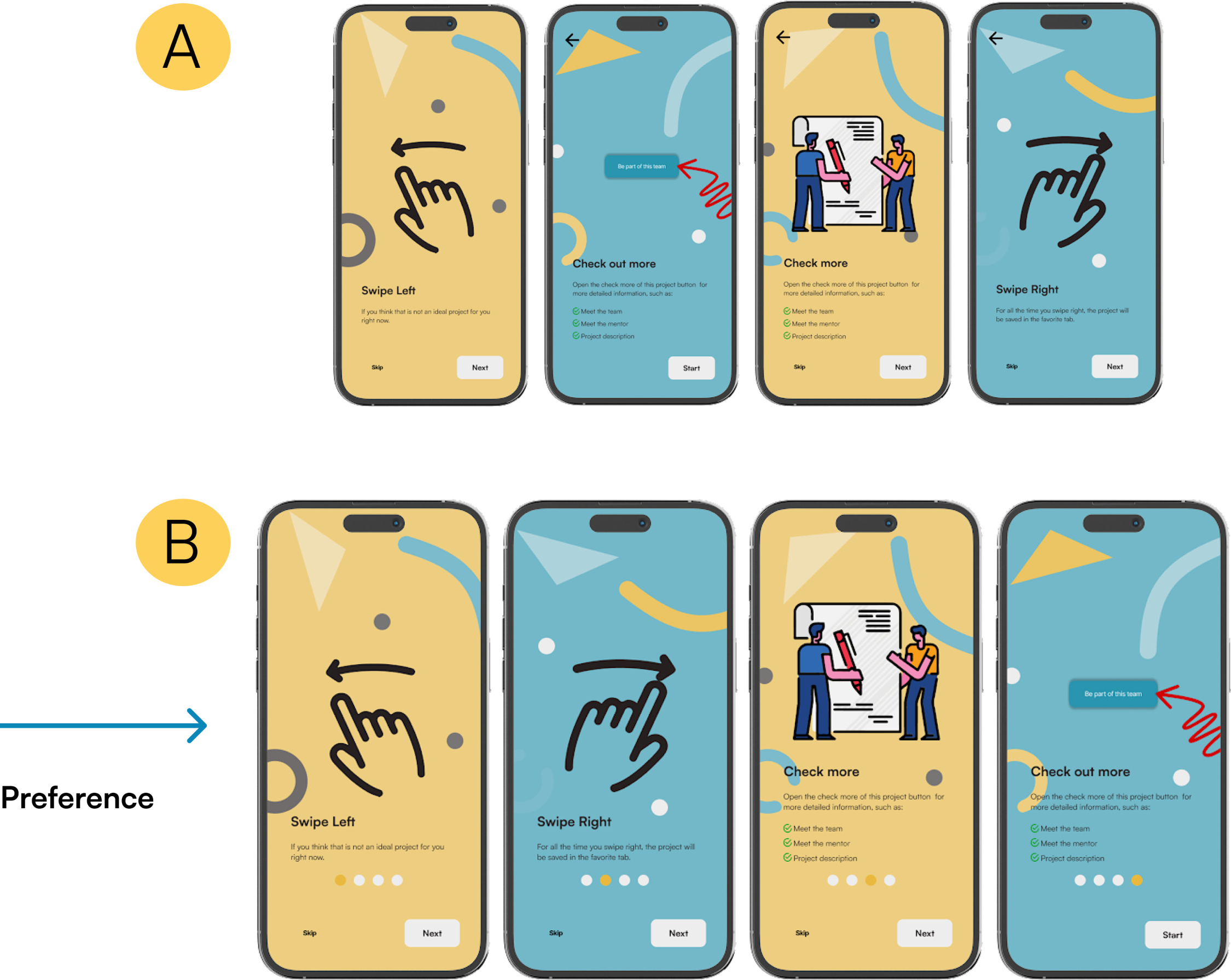 We also iterated on the coaching screens by conducting a preference test. This test revealed that users responded positively to the inclusion of dots that guided them from page to page, along with a button for easy navigation.